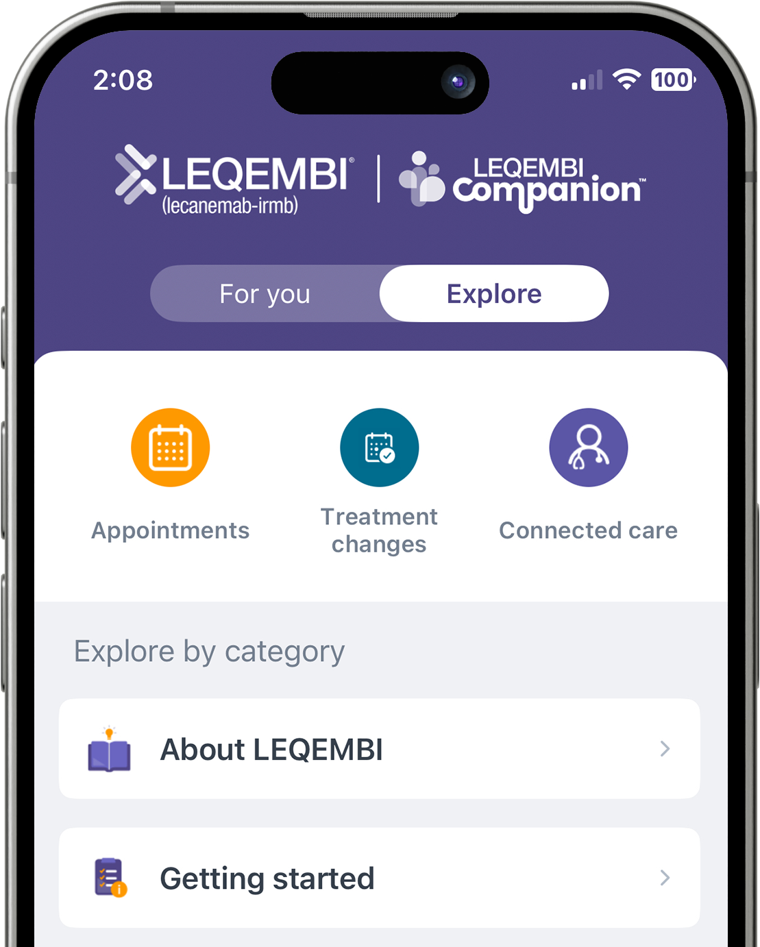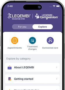 The LEQEMBI Companion app is your digital partner for keeping track of your treatment, appointments, and useful information about infusions and how to inject with LEQEMBI IQLIK.